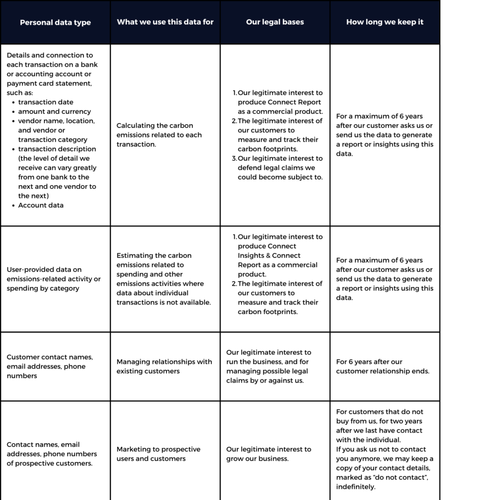 Our carbon insights and accounting services involve analysing our business customer’s bank account and payment card statements. Since we only sell to organisations, we expect most of the transaction data we receive will not contain personal data. However, we cannot guarantee this. For example: